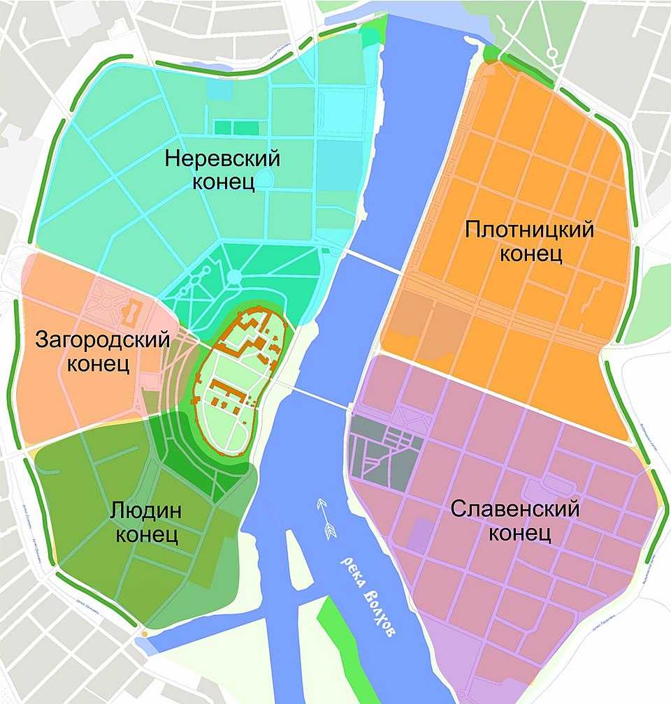 Кроме Новгорода, важными городами Новгородской республики были Псков, Изборск, Великие Луки, Торжок и Ладога. Непосредственно сам Новгород разделялся на пять больших районов («концов»), каждый из которых имел собственные собрания и собственную администрацию. Концы состояли из десятков и сотен, управляемых местными старейшинами и представителями богатых семейств. Такое внутреннее самоуправление способствовало эффективному управлению территориями, несмотря на огромную площадь.
