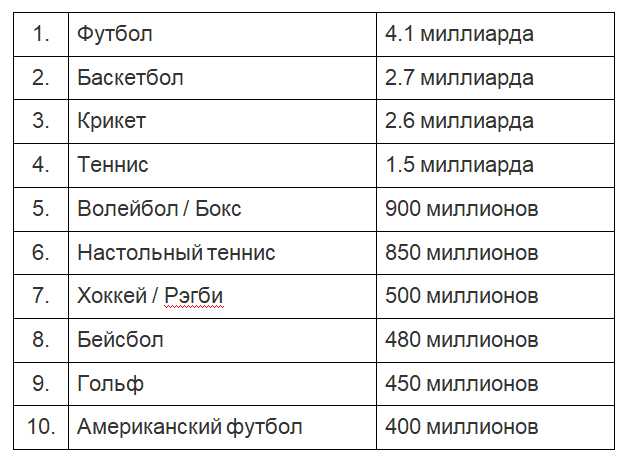 Вот приблизительная статистика о количестве фанатов разных видов спорта: